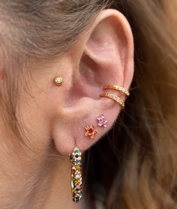 Après la cicatrisation du piercing conch, vous pouvez jouer avec des bijoux qui subliment naturellement la courbe généreuse de cette zone. Les anneaux ornés de strass délicatement sertis sur la tranche apportent une touche d’éclat raffinée, captant la lumière à chaque mouvement.