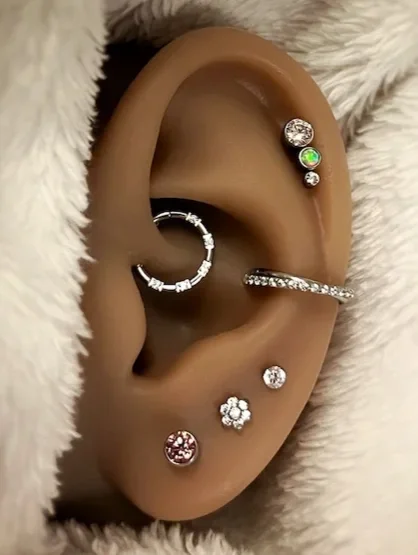 Le piercing au daith permet d’opter pour des bijoux qui épousent parfaitement sa courbe naturelle : anneaux fins, clickers décorés ou modèles sertis de pierres pour un effet élégant et lumineux. La position centrale du daith attire le regard et offre un point d’équilibre visuel entre les piercings internes et externes de l’oreille.
