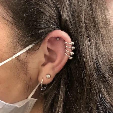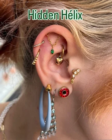 Le hidden hélix, quant à lui, demande des bijoux spécifiques, souvent plus fins et courbés accompagnés d’une chaine qui donne l’illusion que le bijoux n’a aucun point d’accroche.